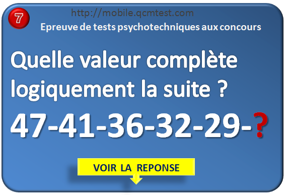Correction du test de Logique n°7. Réponse : 27 Réponse : chaque nouveau chiffre décroit de 6, puis de 5, puis de 4, puis de 3, puis enfin de 2.